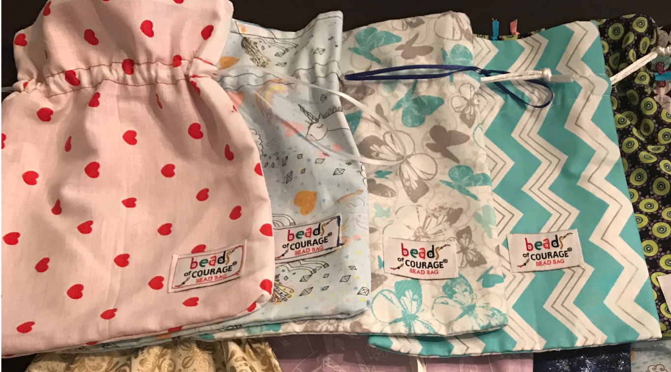 Bead Bags. Guild members stitch bead bags for Beads of Courage. These bags are given to patients at UNC Hospitals to contain beads that they receive during treatments. Each bead signifies a moment of strength and courage.