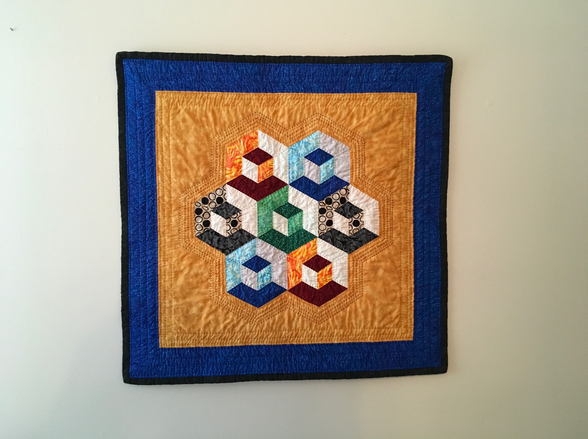 This is a wall hanging I recently made for my son and have already gifted. Center is English paper pieced, then appliquéd onto the gold background. Hand quilted. -- by Patty Ahalt